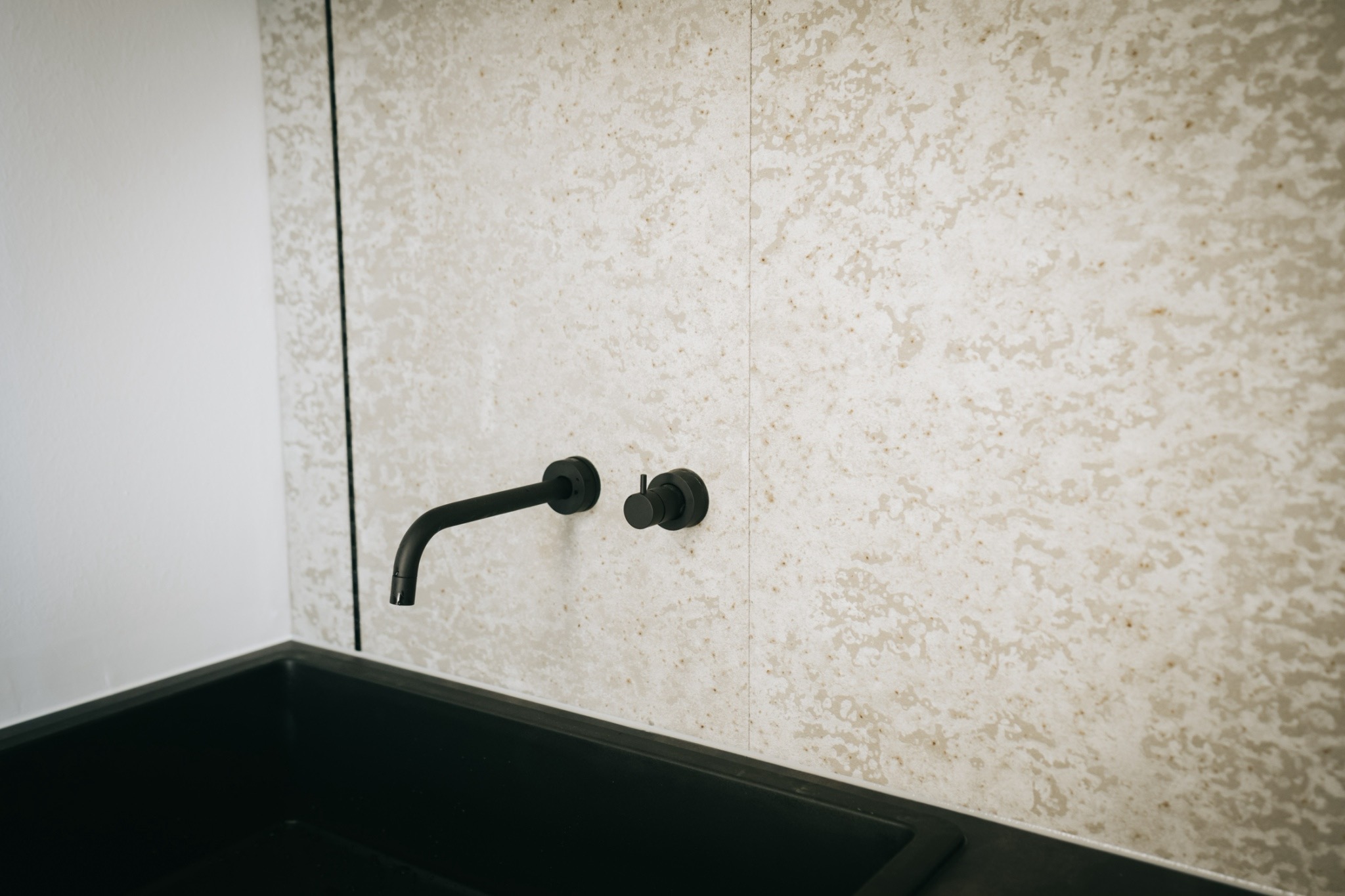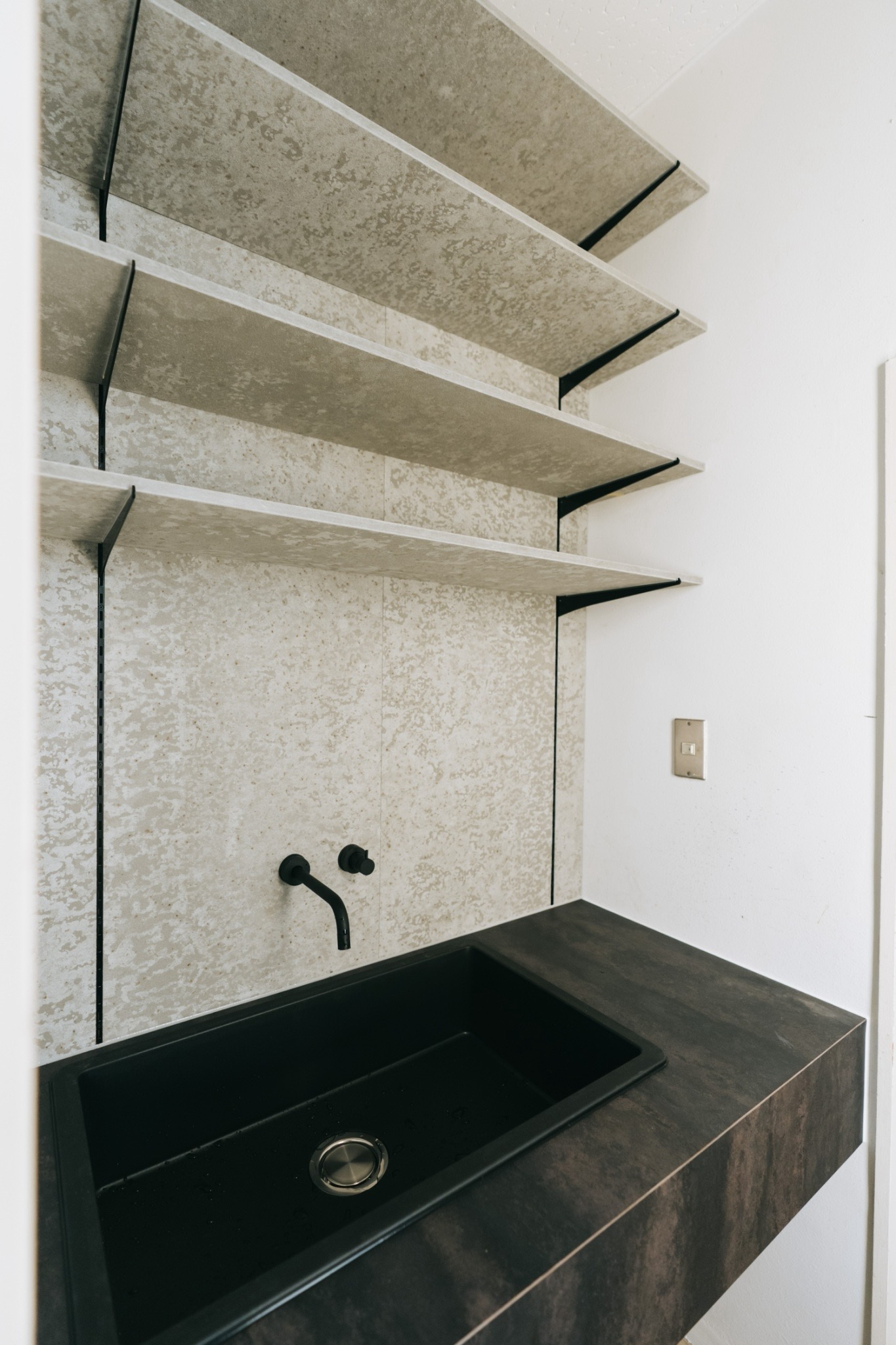 カウンタ―は耐久性が高く、お手入れの容易なメラミンを採用。石目調の表情、水栓パーツや金物など、細部にもこだわりを感じていただける仕上がりです。