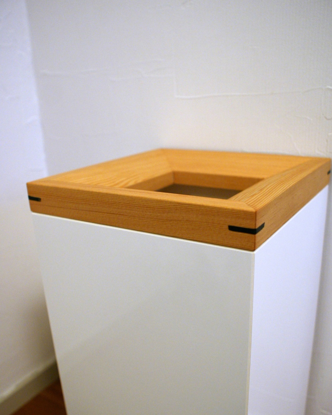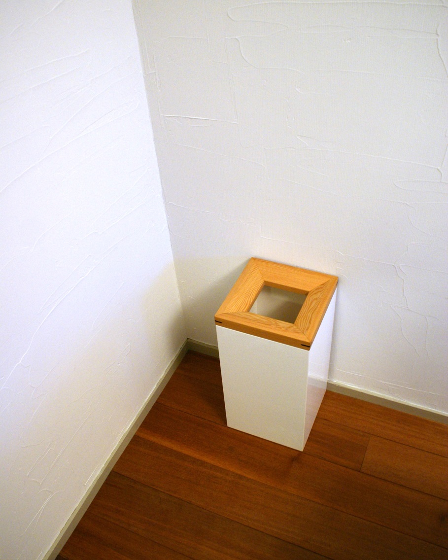 本体には上品な光沢をもつメラミン材を使用し、フレーム部分にはスプルース材のナチュラルな木目をアクセントとしてを加え、清潔感と機能性を兼ね備えたオーダーメイドのダストボックス。