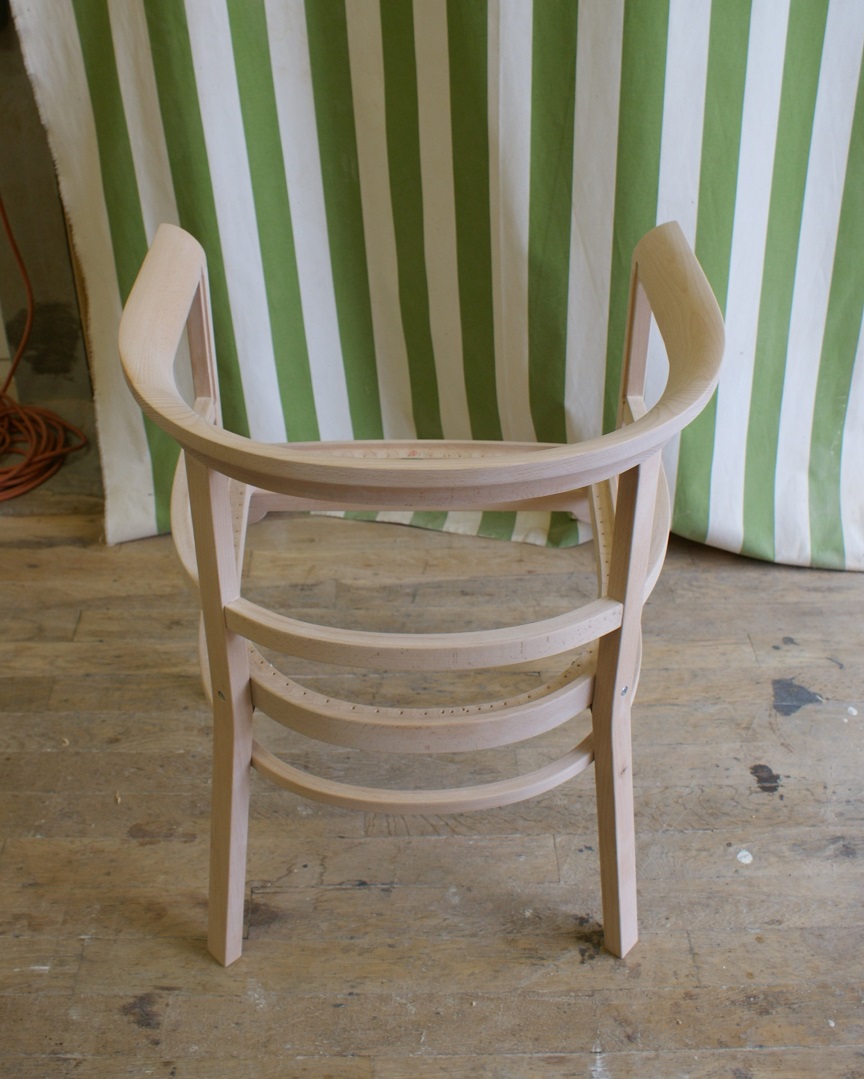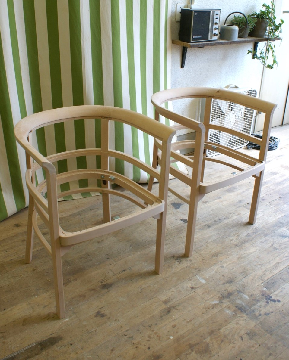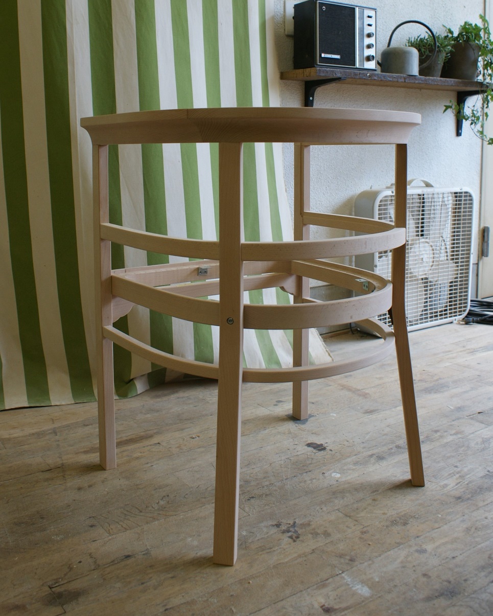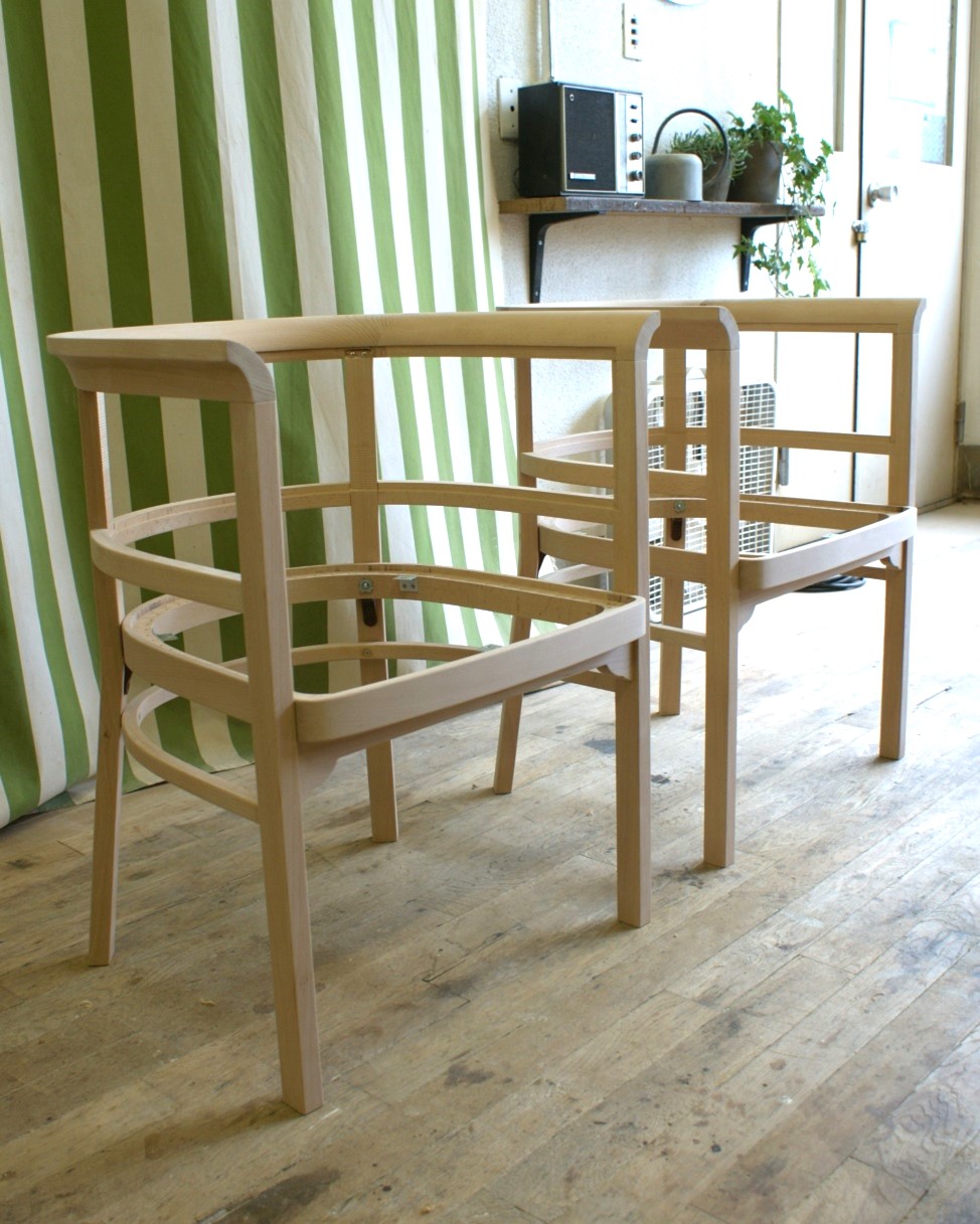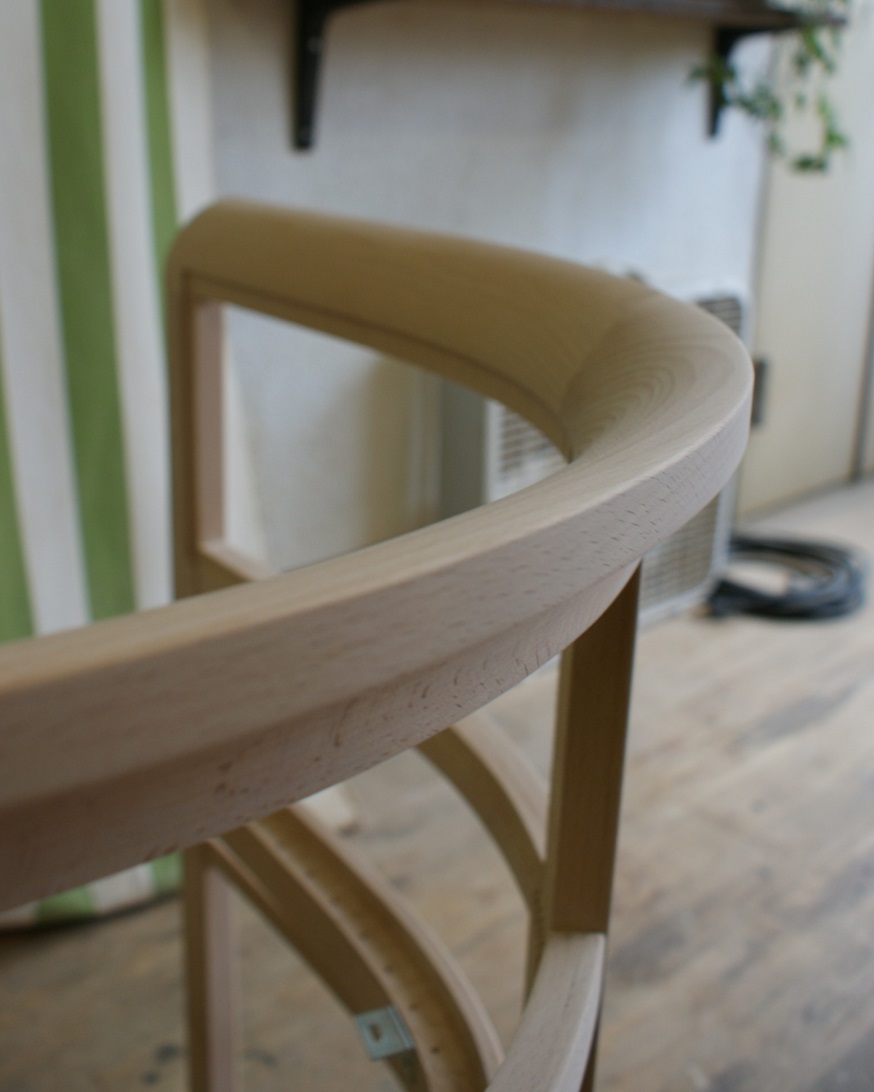 すでに廃番となっていたメーカーの椅子。 特徴的な曲木(まげき)のデザインを忠実に再現するため、現存するモデルから詳細に採寸し、曲げるための専用の型や治具も一から製作しました。