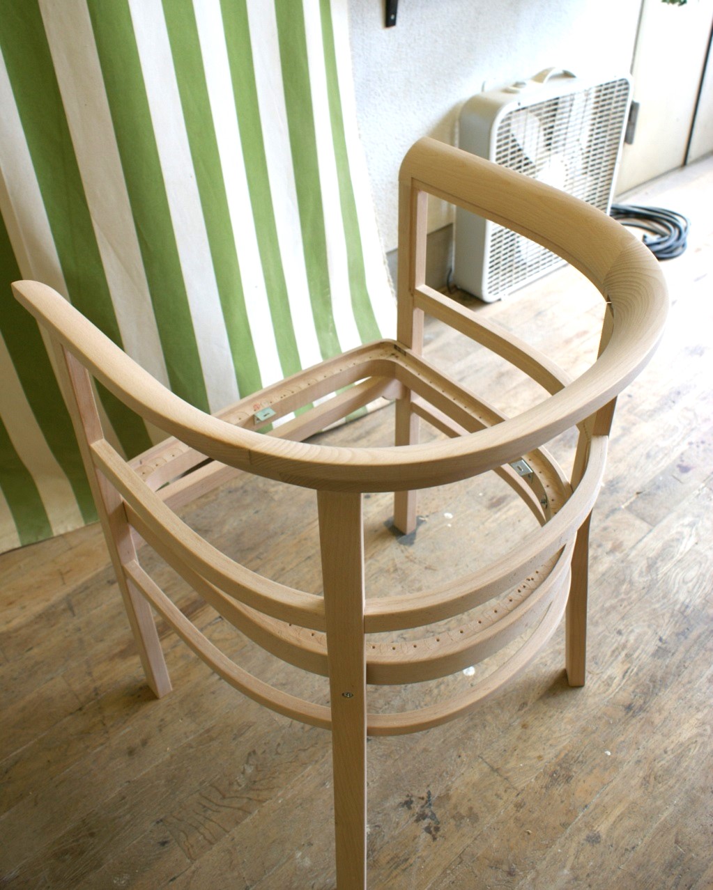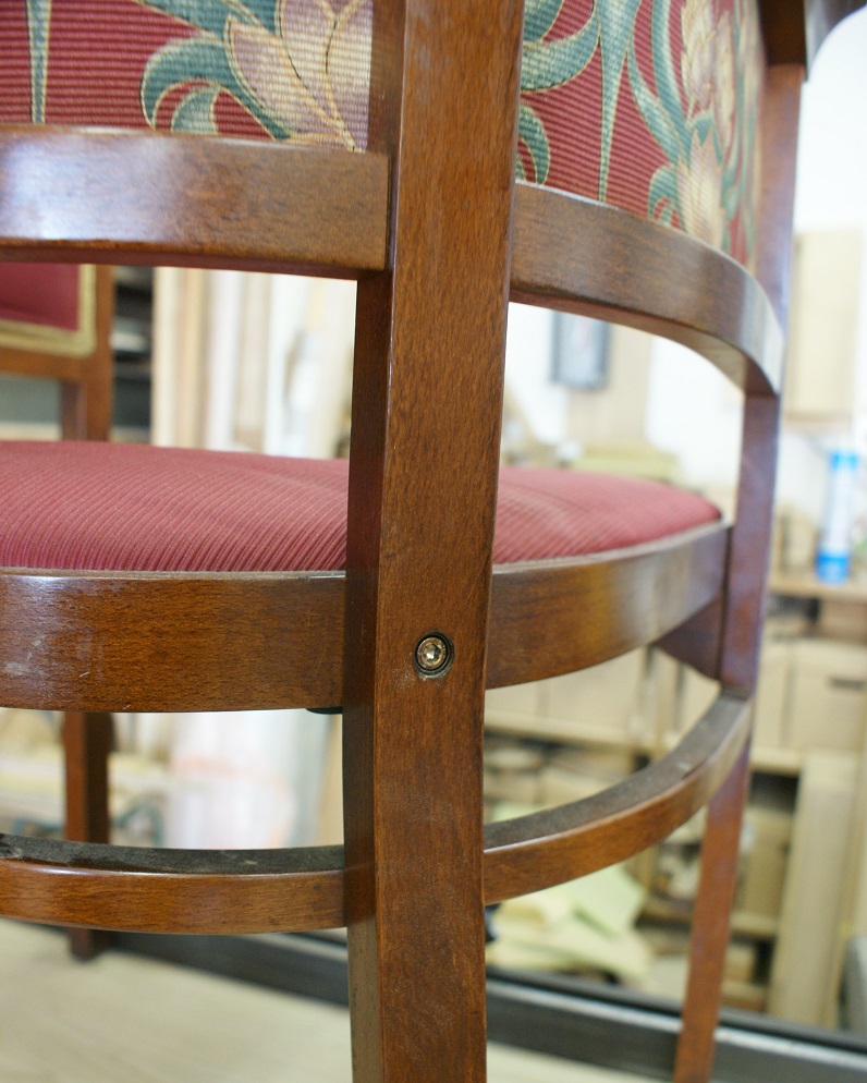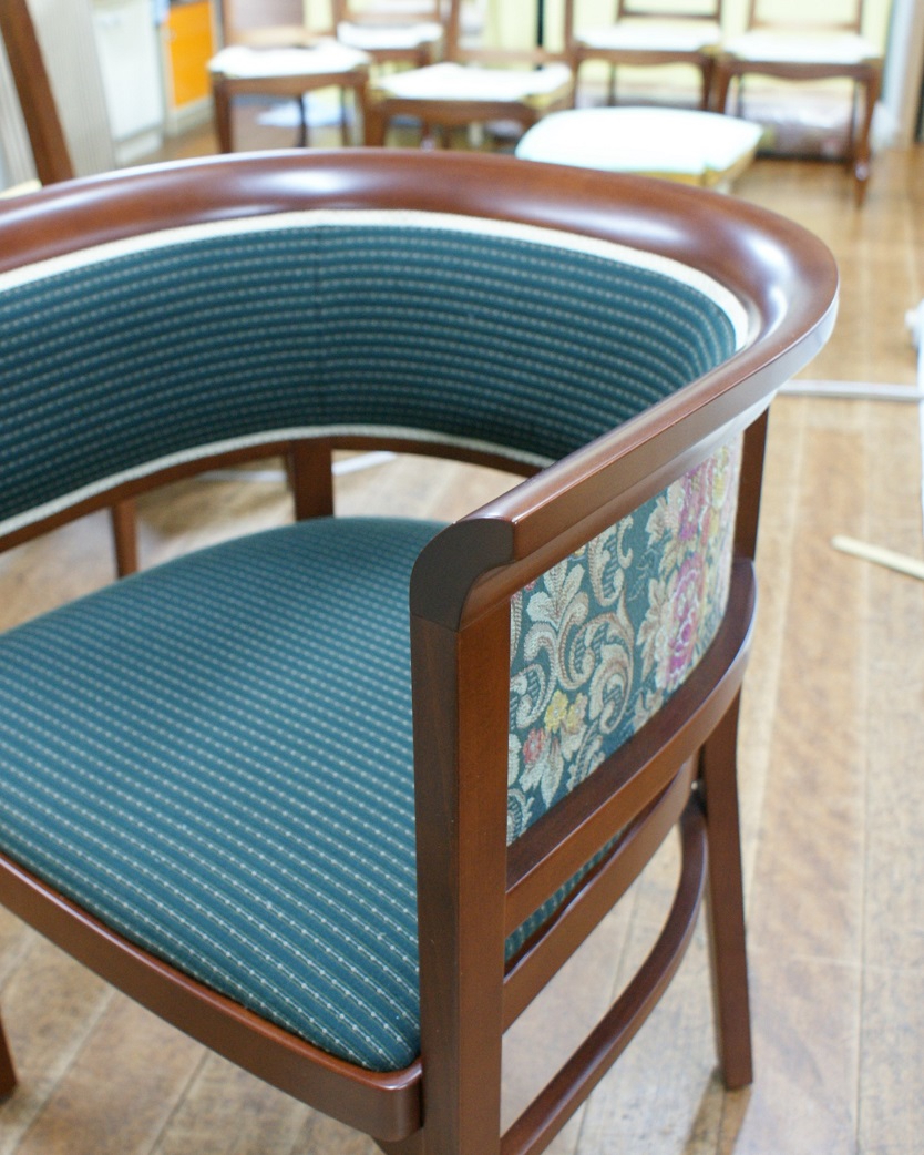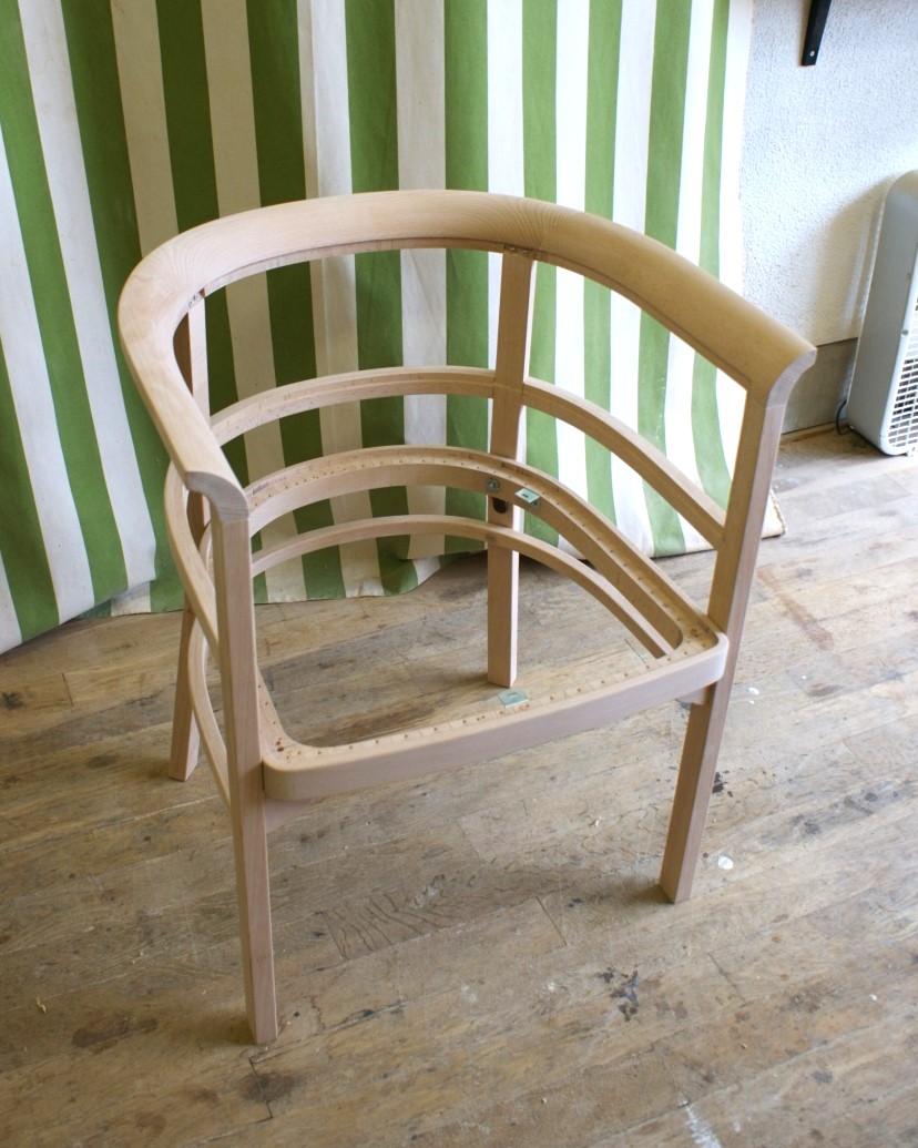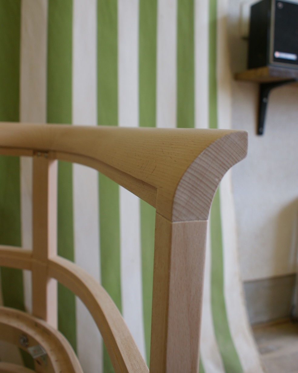 すでに廃番となっていたメーカーの椅子。 特徴的な曲木(まげき)のデザインを忠実に再現するため、現存するモデルから詳細に採寸し、曲げるための専用の型や治具も一から製作しました。