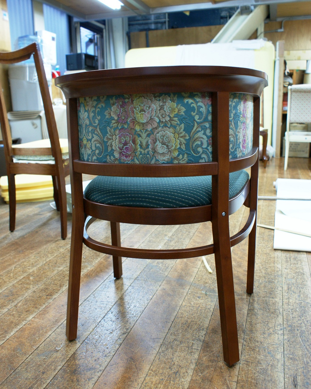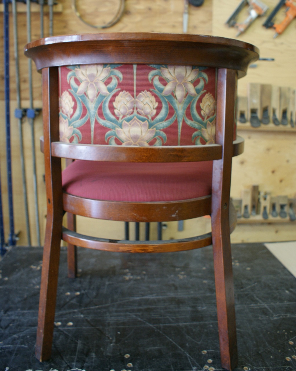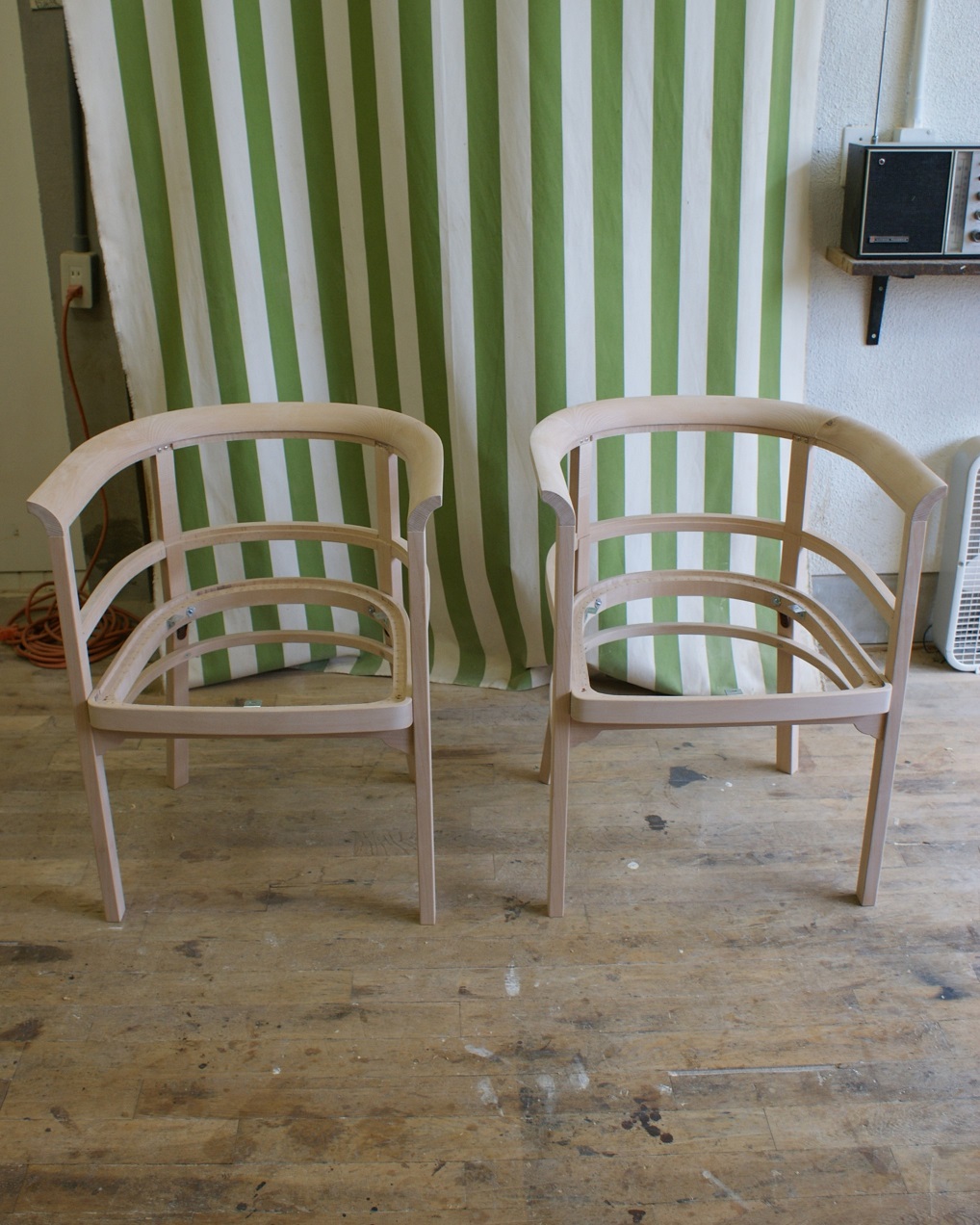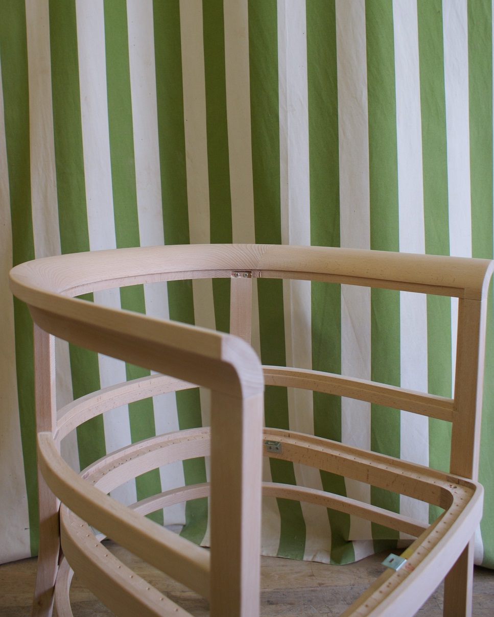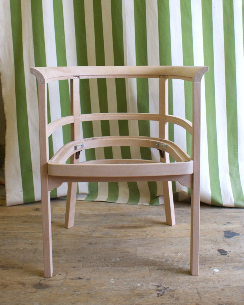 すでに廃番となっていたメーカーの椅子。 特徴的な曲木(まげき)のデザインを忠実に再現するため、現存するモデルから詳細に採寸し、曲げるための専用の型や治具も一から製作しました。