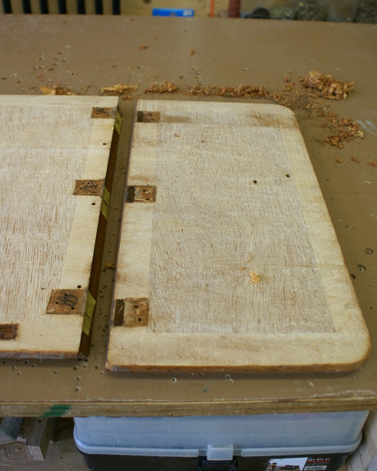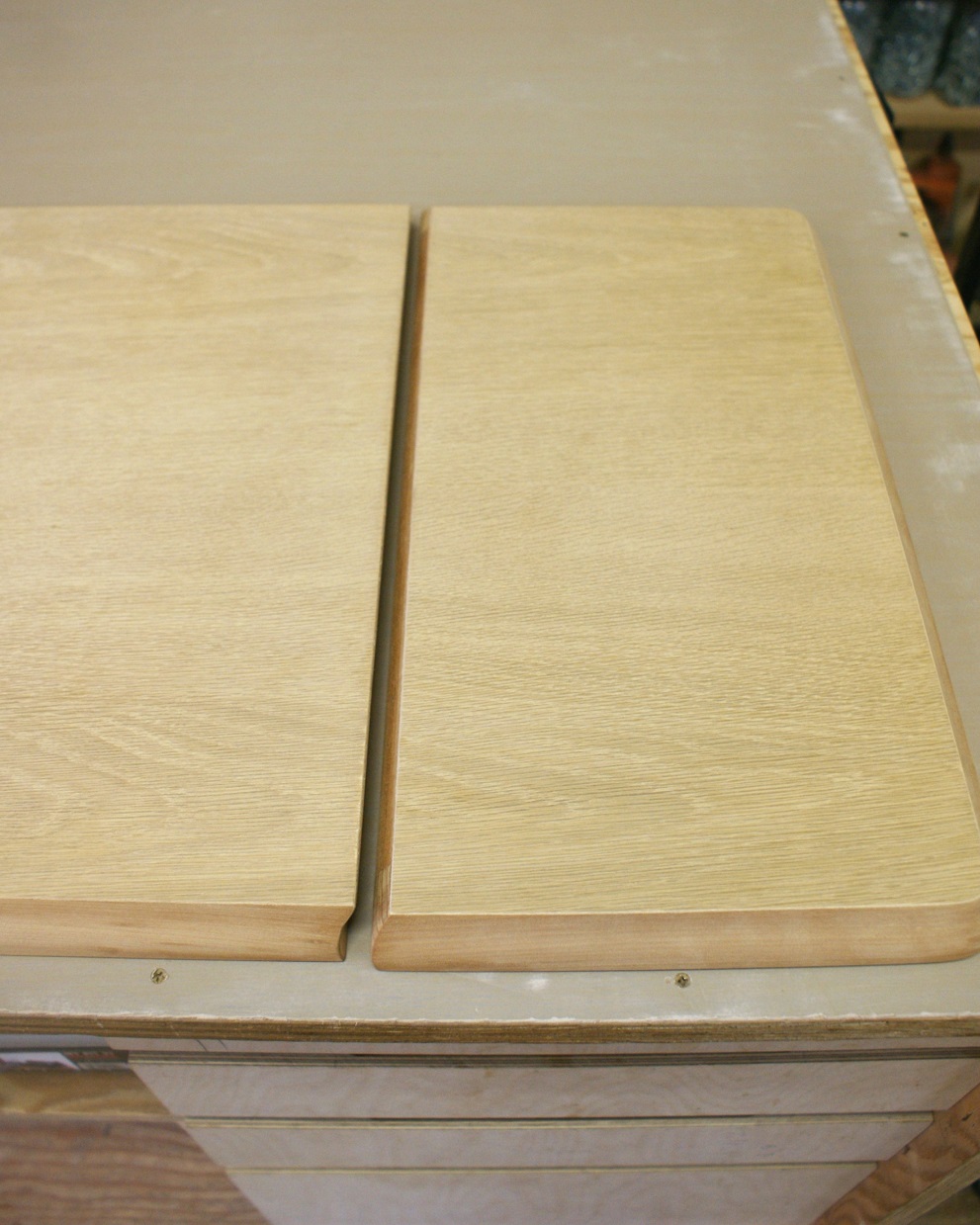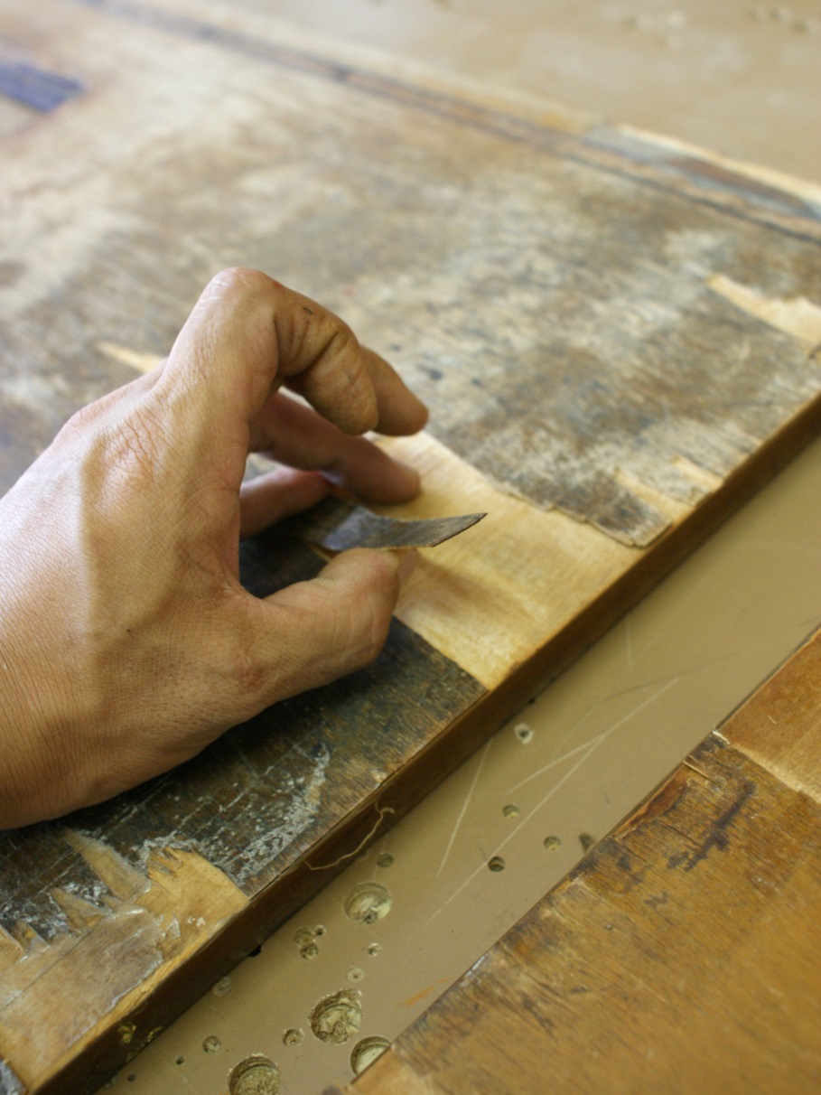 ひとつひとつのパーツを解体しながら症状を見極め、天板の突板を丁寧に剥がし、新しい突板を一枚づつ手作業で貼り直しました。