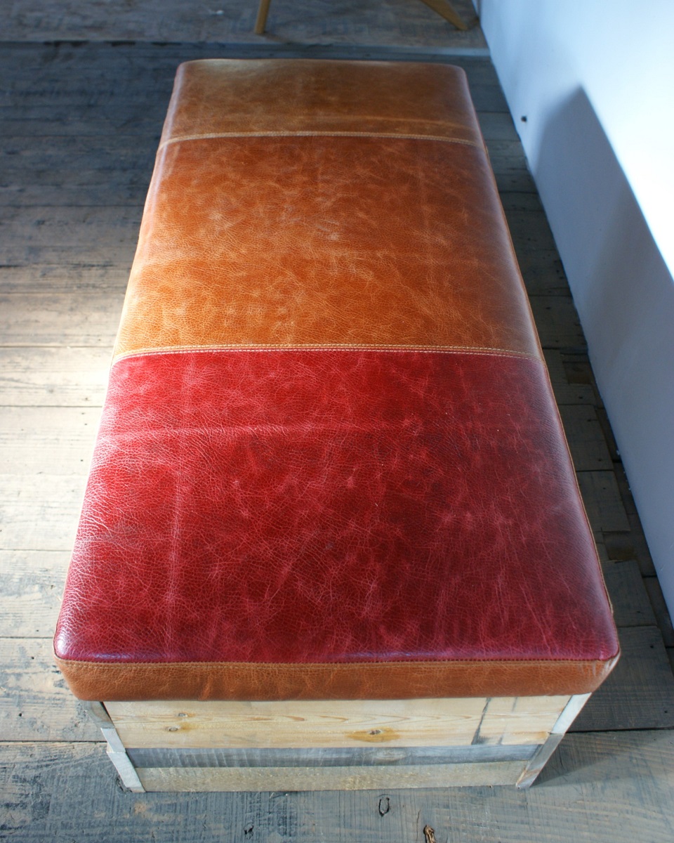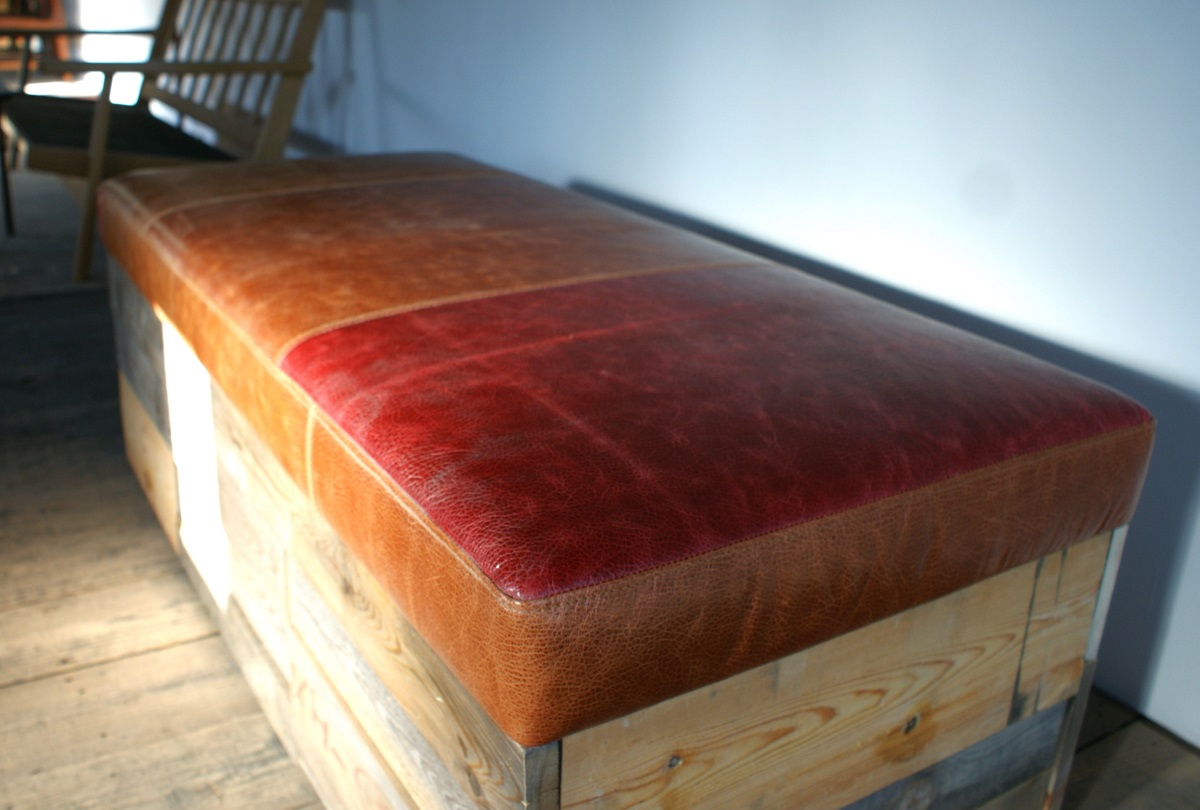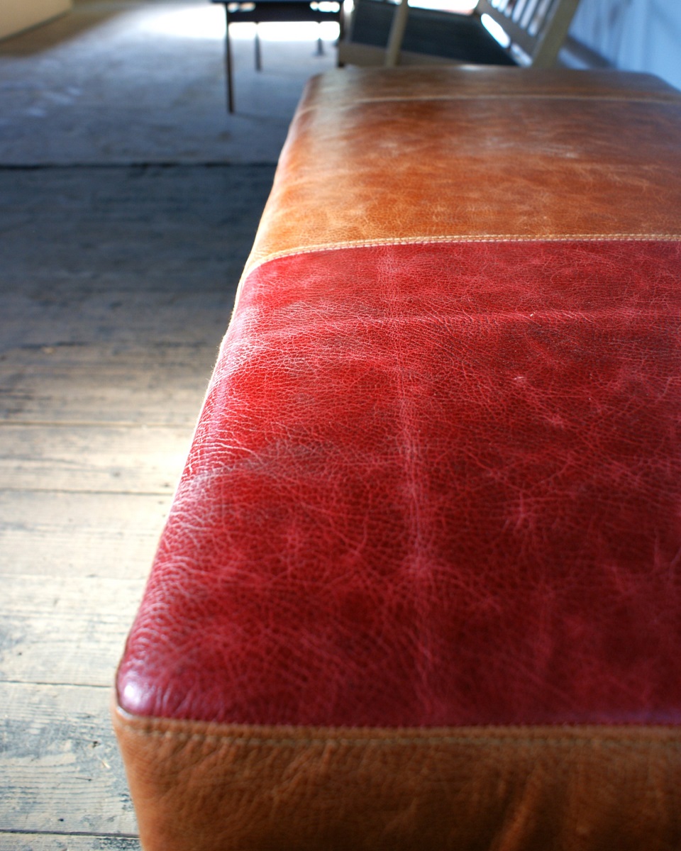 色の異なる本革を丁寧にパッチワークで仕上げたシートに、時を重ねた古材を組み合わせた、味わい深いヴィンテージベンチ。