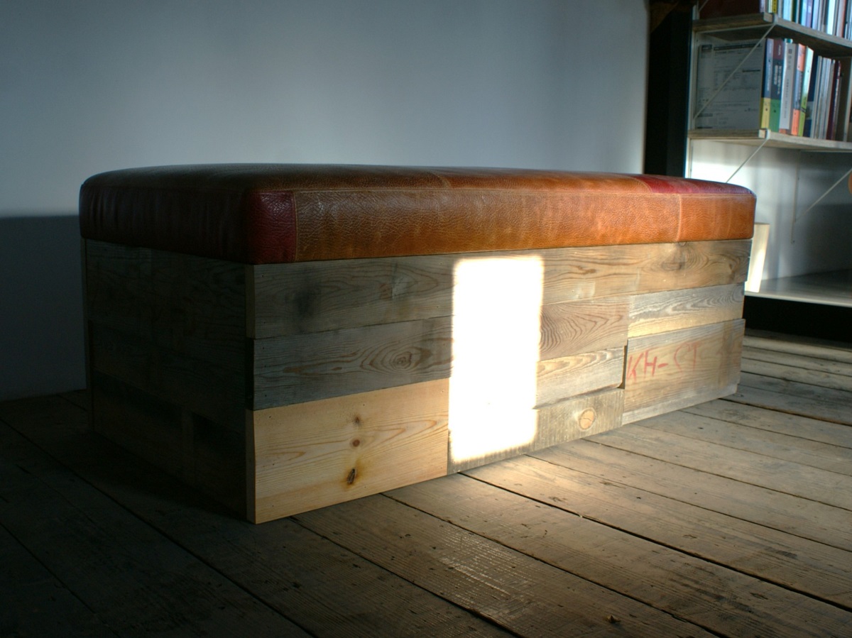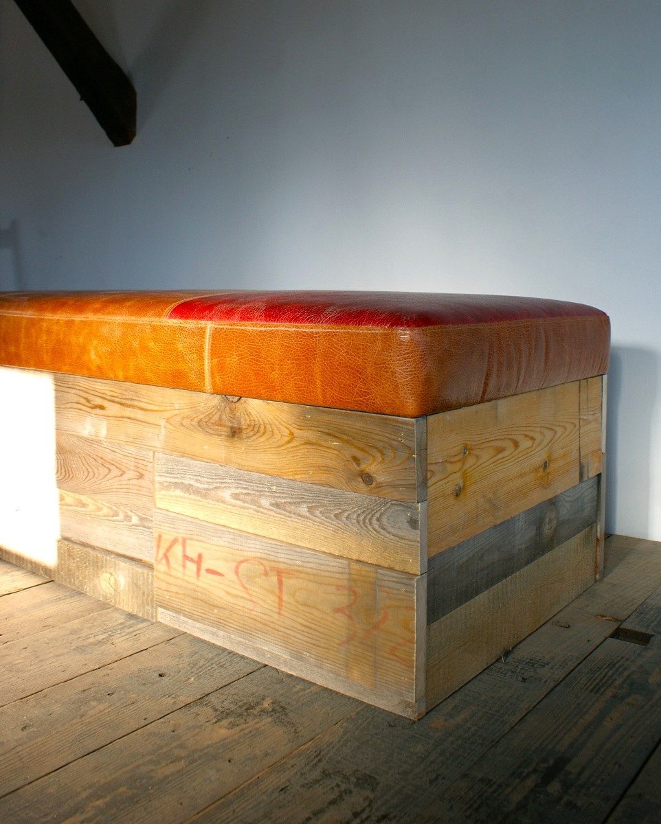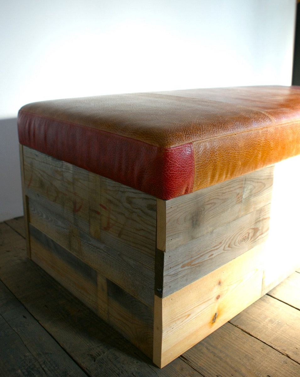色の異なる本革を丁寧にパッチワークで仕上げたシートに、時を重ねた古材を組み合わせた、味わい深いヴィンテージベンチ。
