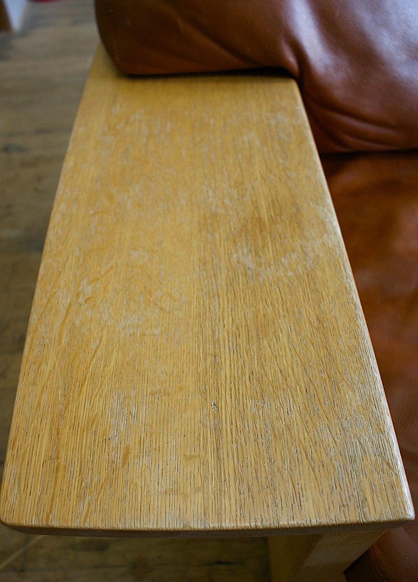 クッションは長年の使用により内材の消耗が大きく、レザーに皺が寄るほどに「へたり」がありました。