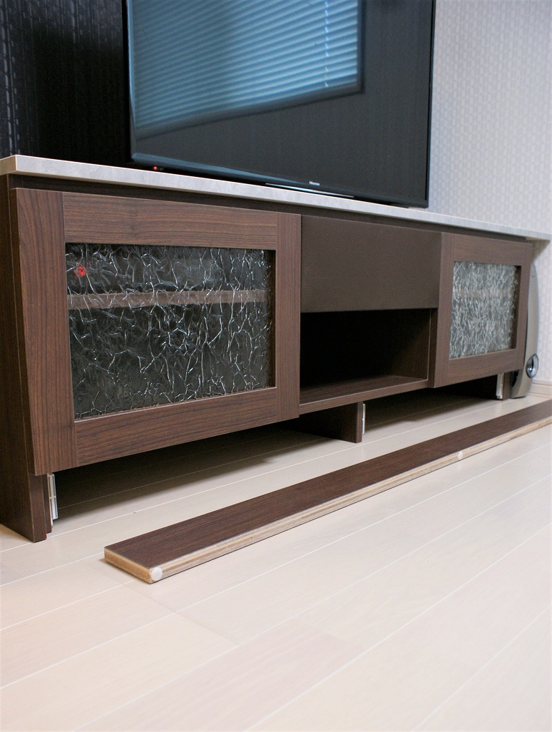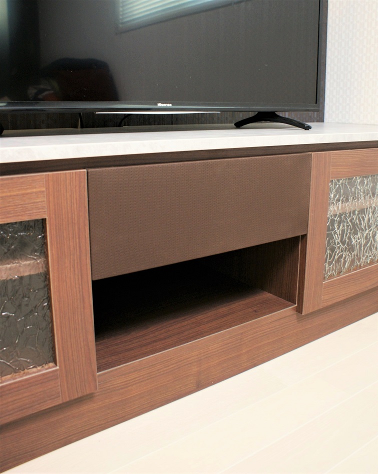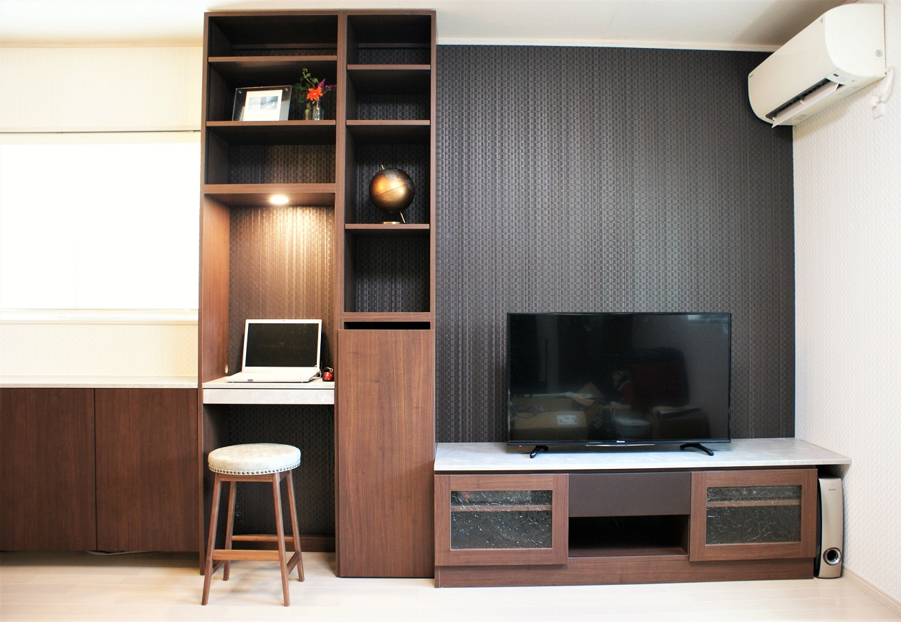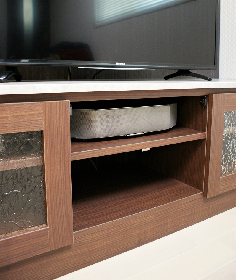 壁面右部にはTVボード、こちらも実際にご使用されている機器類のサイズ採寸を行い配置箇所や本体の使い勝手をお聞きしてご提案しております。