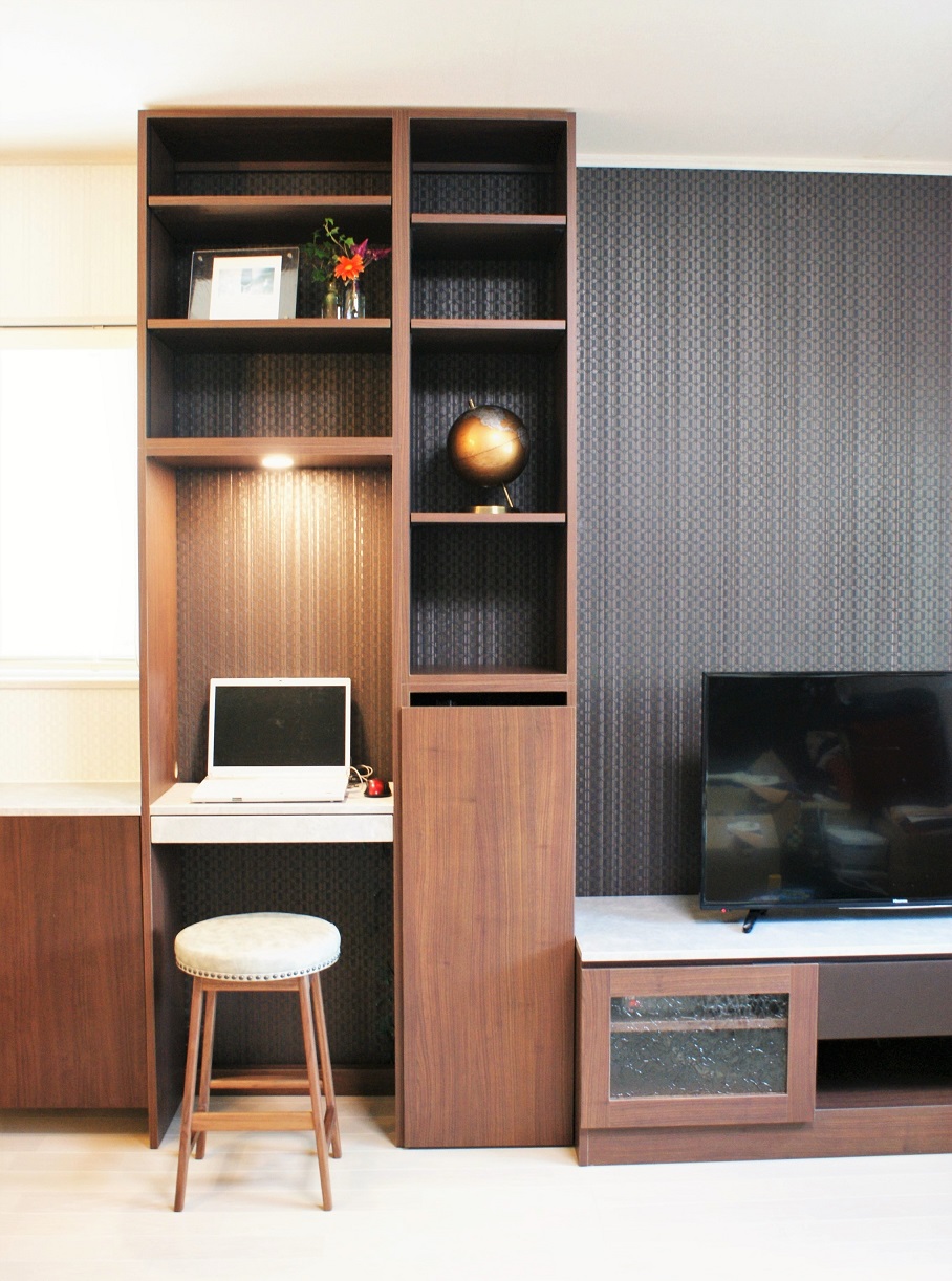 設置前、窓下には既存のキャビネット(窓下)が右の濃淡クロス側へはみ出る形に収まっておりましたが、家具設置の際に移設し天板を新たに加える事でカウンターとしてスペース使いができるようにとご提案しました。