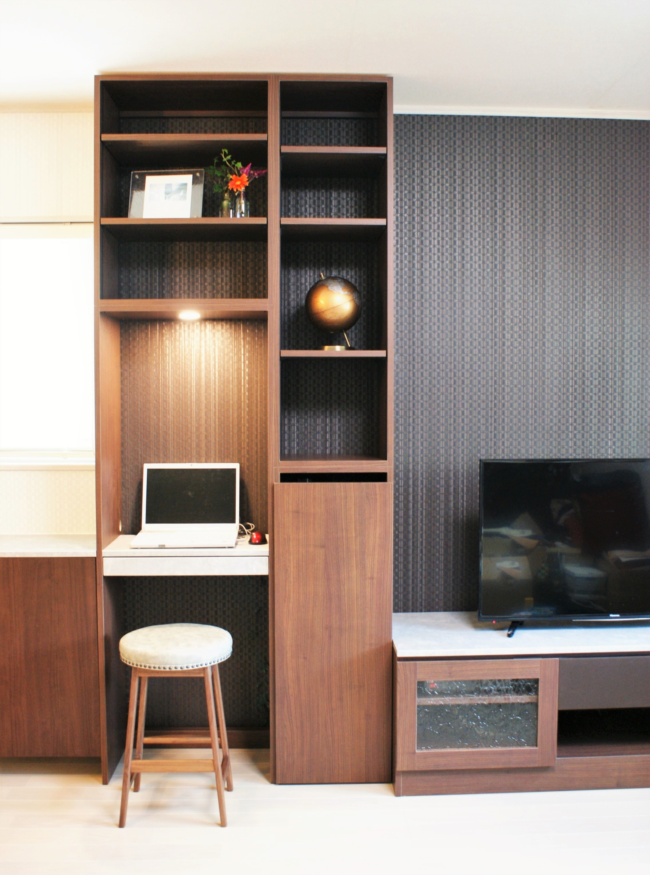 背景となるクロスは窓枠右からパターンが変わっており、家具を天井高までとする事で境目を覆い違和感をなくしました。
