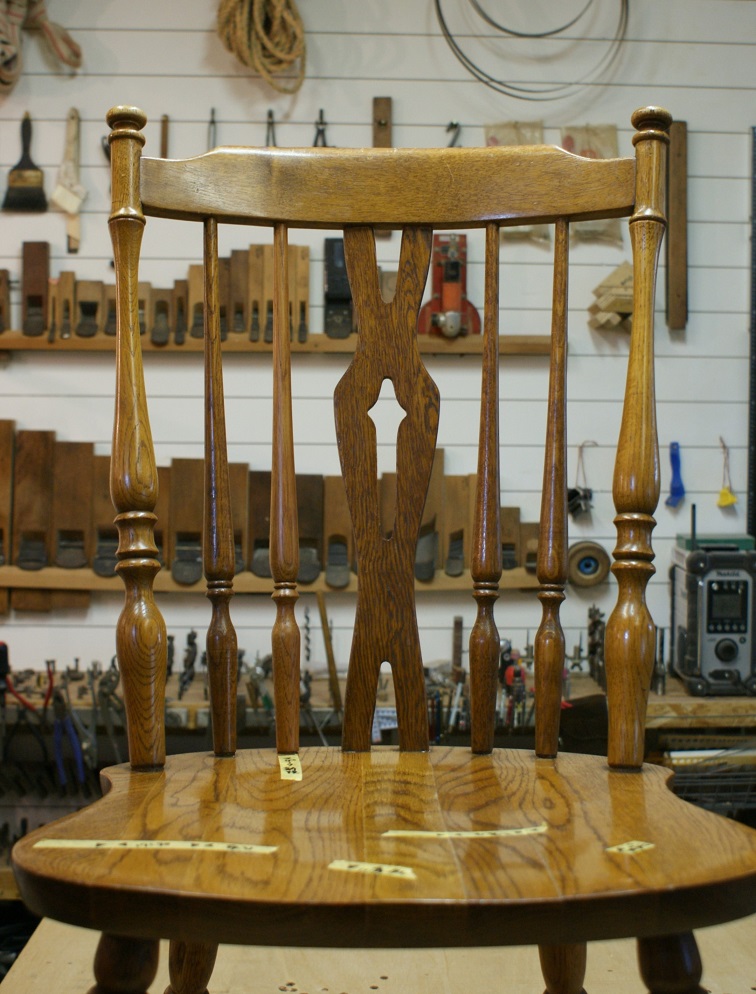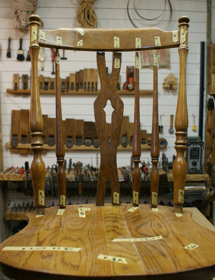 お預かりした椅子は座面の割れ、接合部の緩み、背もたれスポークの欠損。